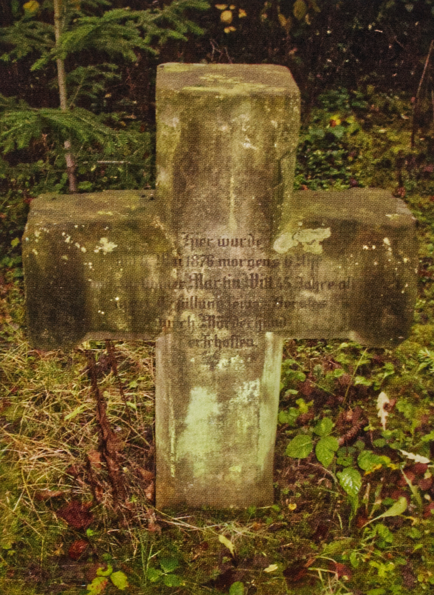 Es ist etwa einen Meter hoch und erinnert an den Waldhüter Martin Witt, der hier im Jahr 1876 in Ausübung seiner Pflicht von Wilderern erschossen wurde.