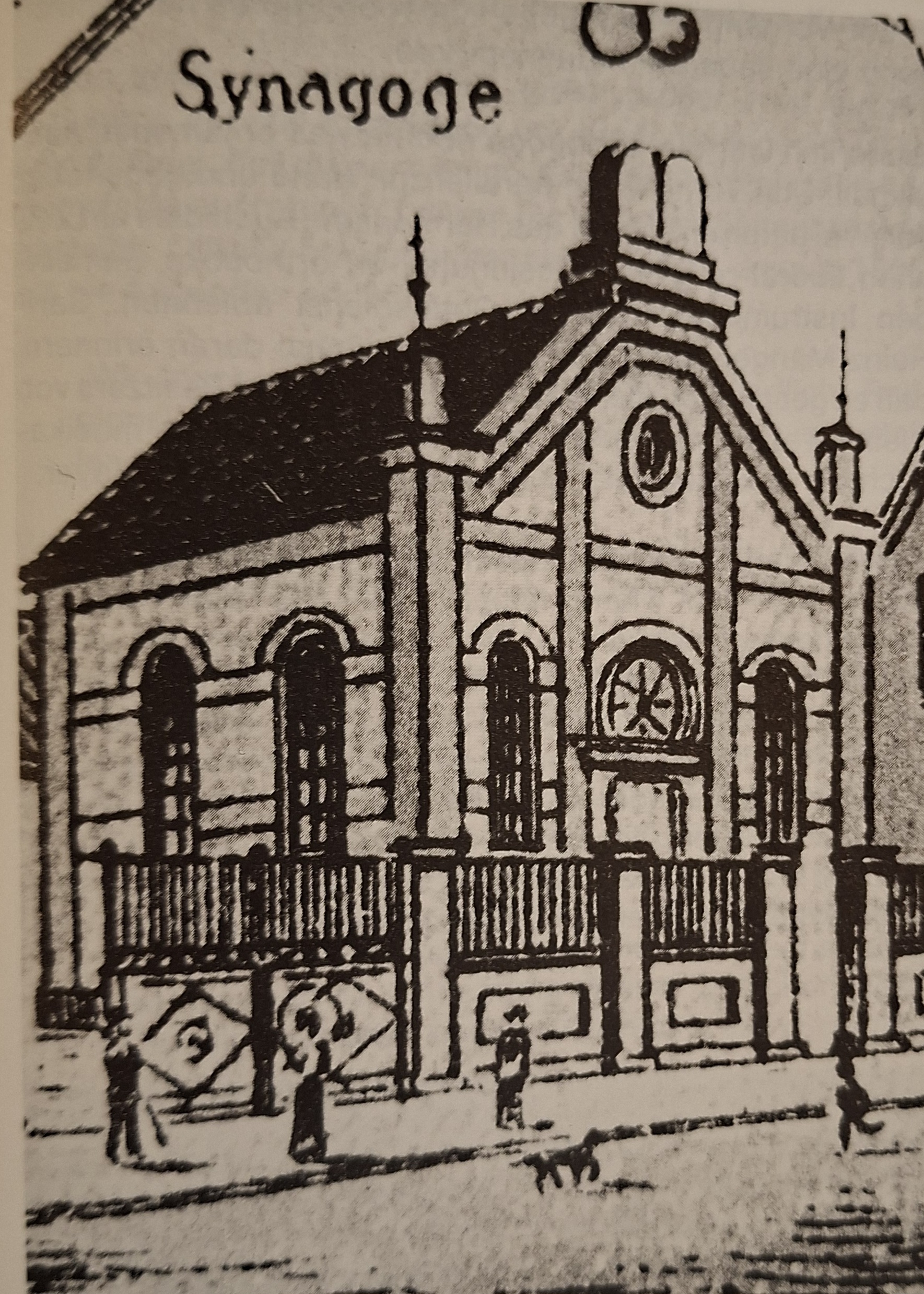 Die Synagoge war architektonisch etwas Besonderes. Sie hatte einen großen Hufeisenbogen über dem Eingang, eine blaue Decke mit Sternen und einen hellen Toraschrein aus Holz. Über viele Jahre war sie das Zentrum des jüdischen Gemeindelebens: Hier wurde gebetet, gefeiert und zusammengekommen.